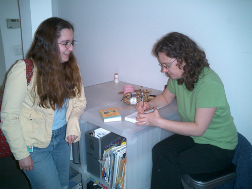 October 18, 2005Books and knitting and cake, oh my!So who's going to Willow Books tonight for the book launch party? I'll be watching for Kristen... anyone else? I'll be the short girl with long brown hair wearing a burgundy velour dress (um, it's not as fancy as it sounds, really) and kitty shoes. Perhaps a better distinguishing characteristic for this particular event is that I'll be with my roommate, who will most likely be one of the relatively few men there. Tallish, dark blond hair and beard, burgundy sweater. (No, we didn't plan the matching color thing.) If you see us, say hi! And leave a comment so I know to look for you.